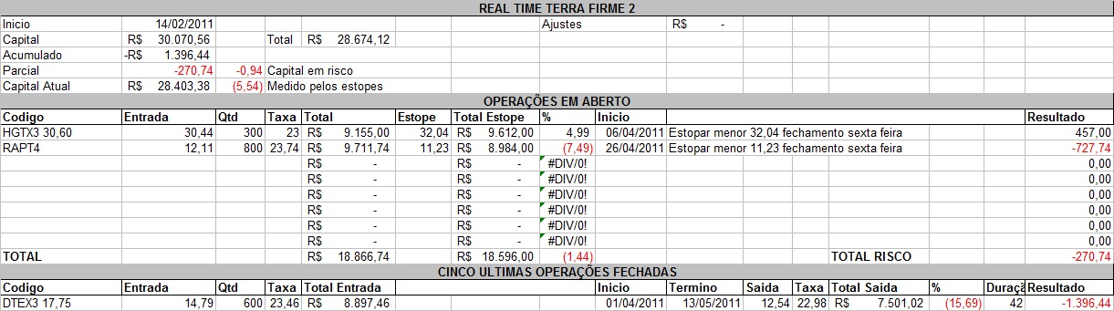 OBS: Devido o aumento das forças baixistas nas ultimas quatro semanas, alguns ativos que estamos comprados começam uma aproximação perigosa a pontos de reversão de tendência, sugerindo novas quedas. Deste modo os estopes podem mudar de FECHAMENTO para IMEDIATO. O objetivo é tentar preservar o capital.